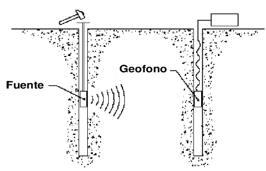 Este ensayo se realiza según la norma D4428 ASTM, con unas distancias entre el “sondeo emisor” y el “sondeo receptor” de 3 a 10 m (un sondeo o varios) y con la fuente de energía (emisor) y el geófono triaxial (receptor) a la misma cota.