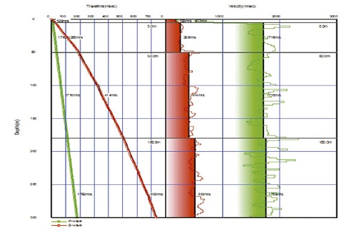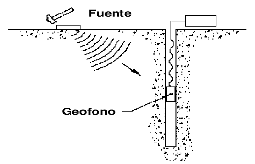 - Las ondas P y S se generan en la superficie y próximas al sondeo (generalmente 5m). Estas son registradas con un geófono triaxial, a diferentes profundidades (generalmente cada metro) a lo largo del sondeo.