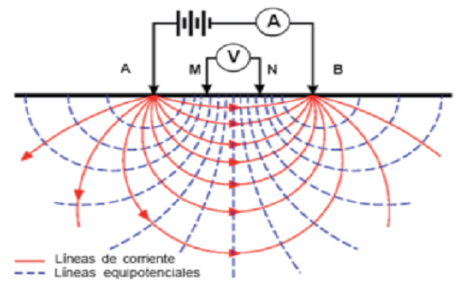 Los métodos eléctricos para el estudio del subsuelo funcionan aplicando una corriente eléctrica (Amp) continua (DC) al subsuelo por un par de electrodos y midiendo su diferencia de potencial (V) en otro par de electrodos. Relacionando estas dos magnitudes, podemos determinar la distribución resistiva vertical y horizontal del subsuelo, tomando lecturas desde la superficie de la misma. La resistividad del suelo se relaciona con varios parámetros geológicos como el mineral, contenido de fluido, porosidad de la roca y saturación de agua.