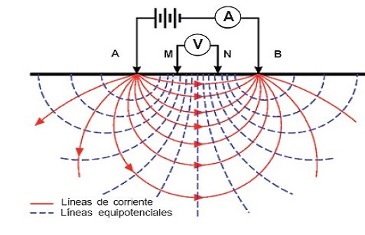 Este método eléctrico consiste en inyectar corriente al terreno mediante dos electrodos que son clavados en el mismo, conocidos como A y B; el campo eléctrico así generado se monitorea a través de mediciones de diferencias de potencial ΔV entre otros dos electrodos, conocidos como M y N.